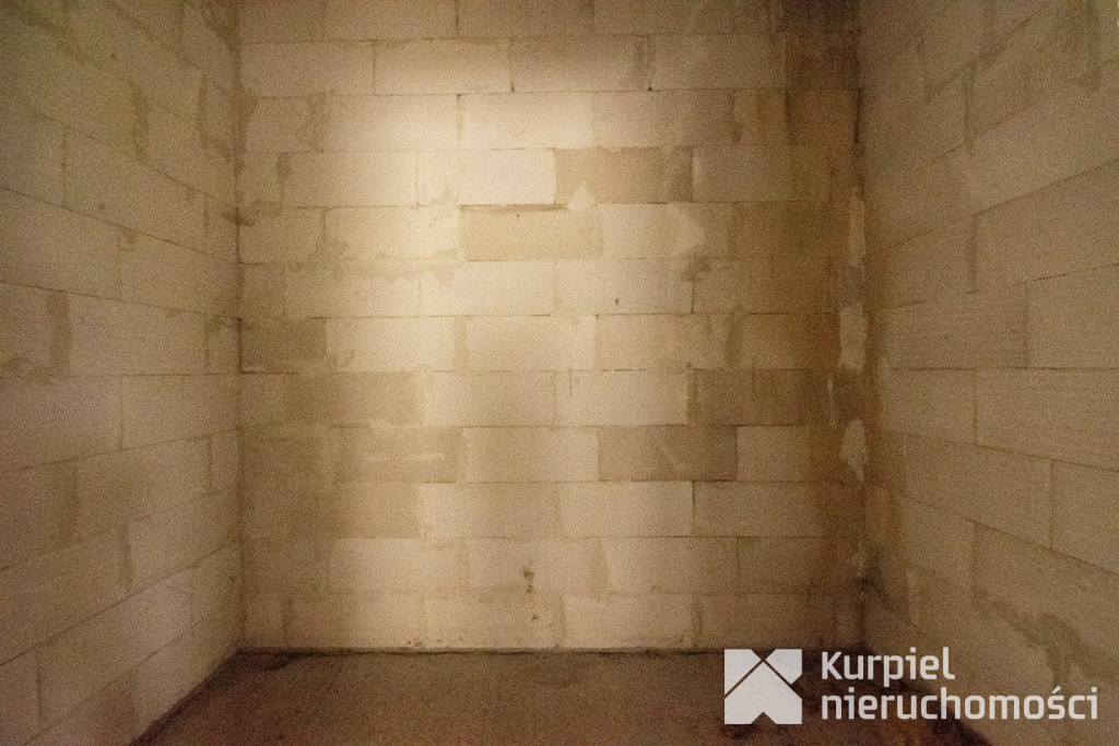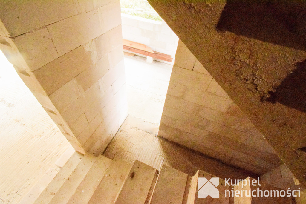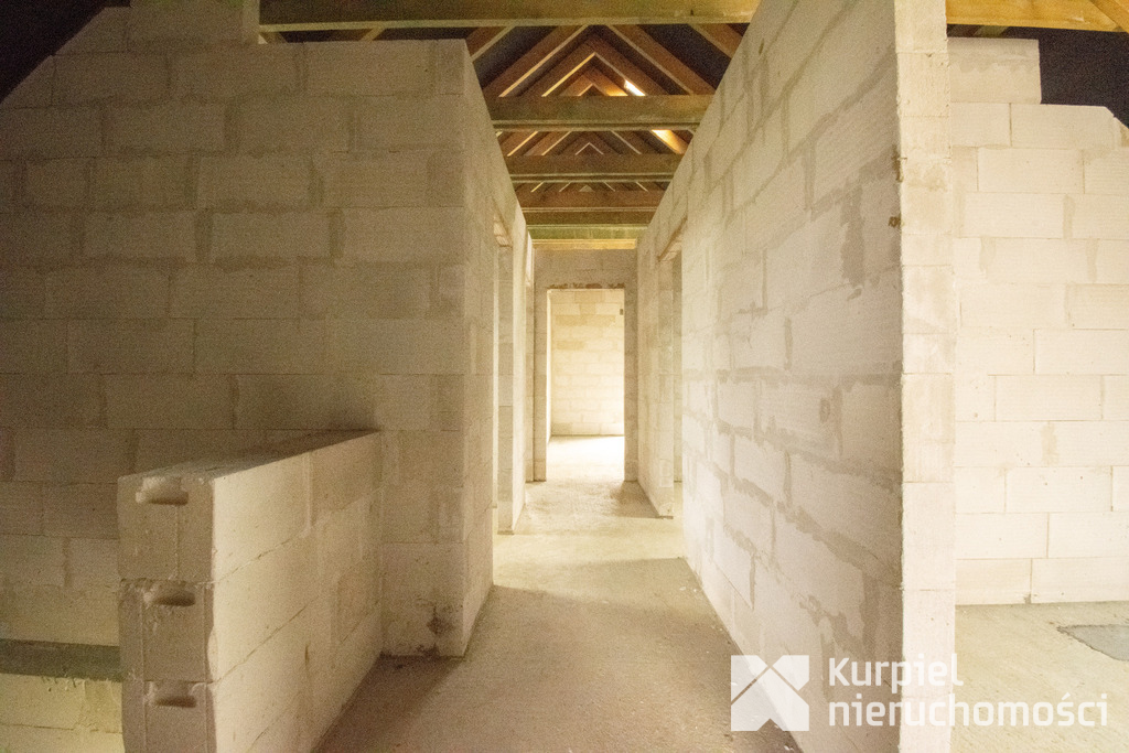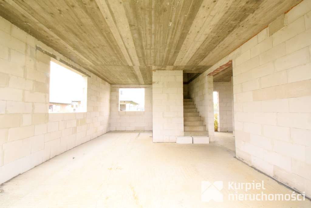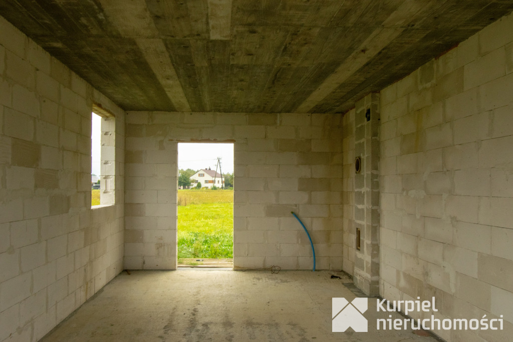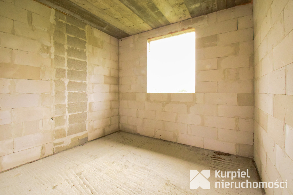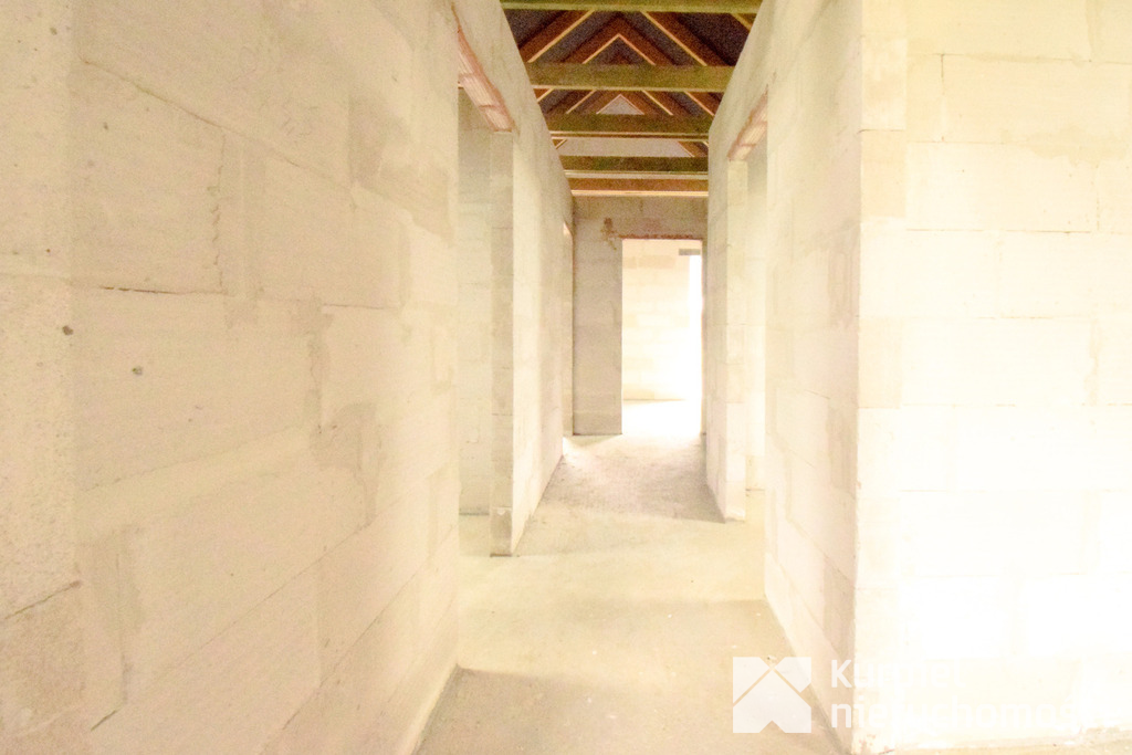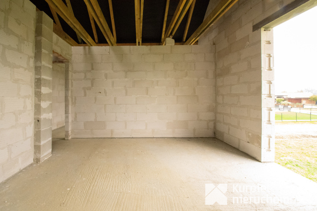 Dom wymaga wykończenia od zera – same mury, otwarty stan surowy – co daje pełną swobodę wyboru materiałów, układu wnętrz, wykończenia i instalacji.