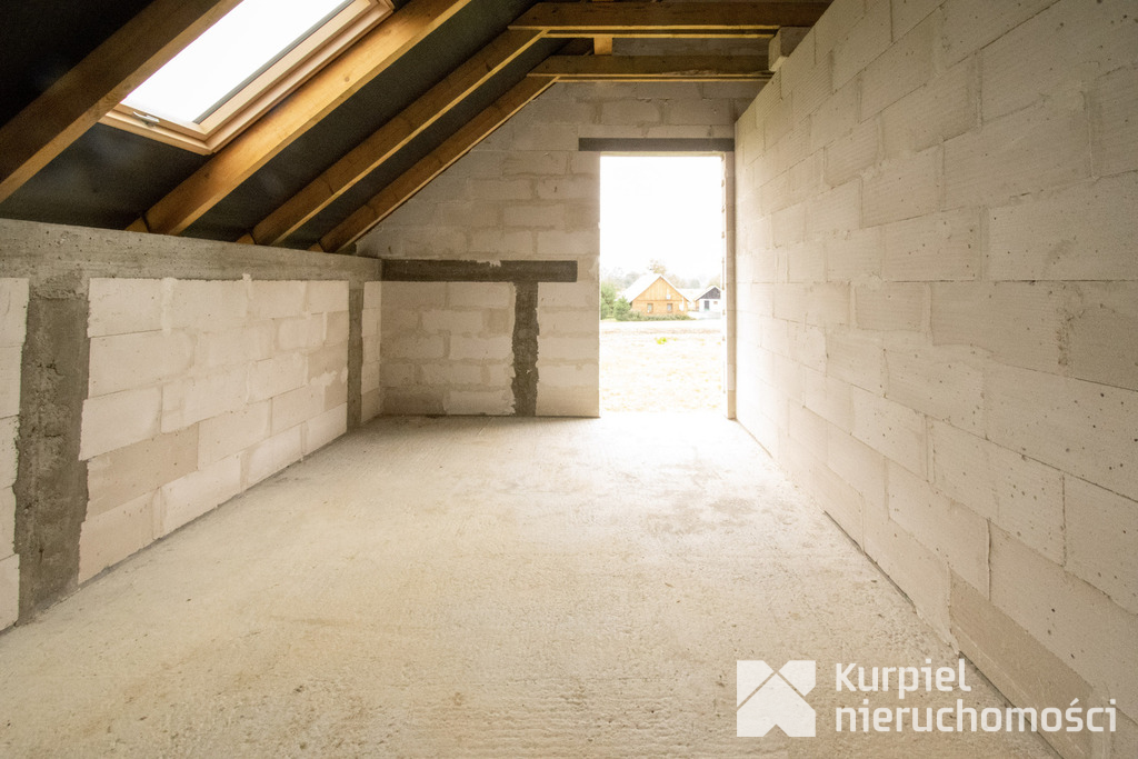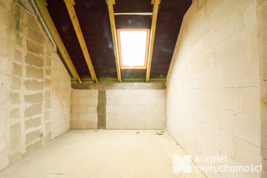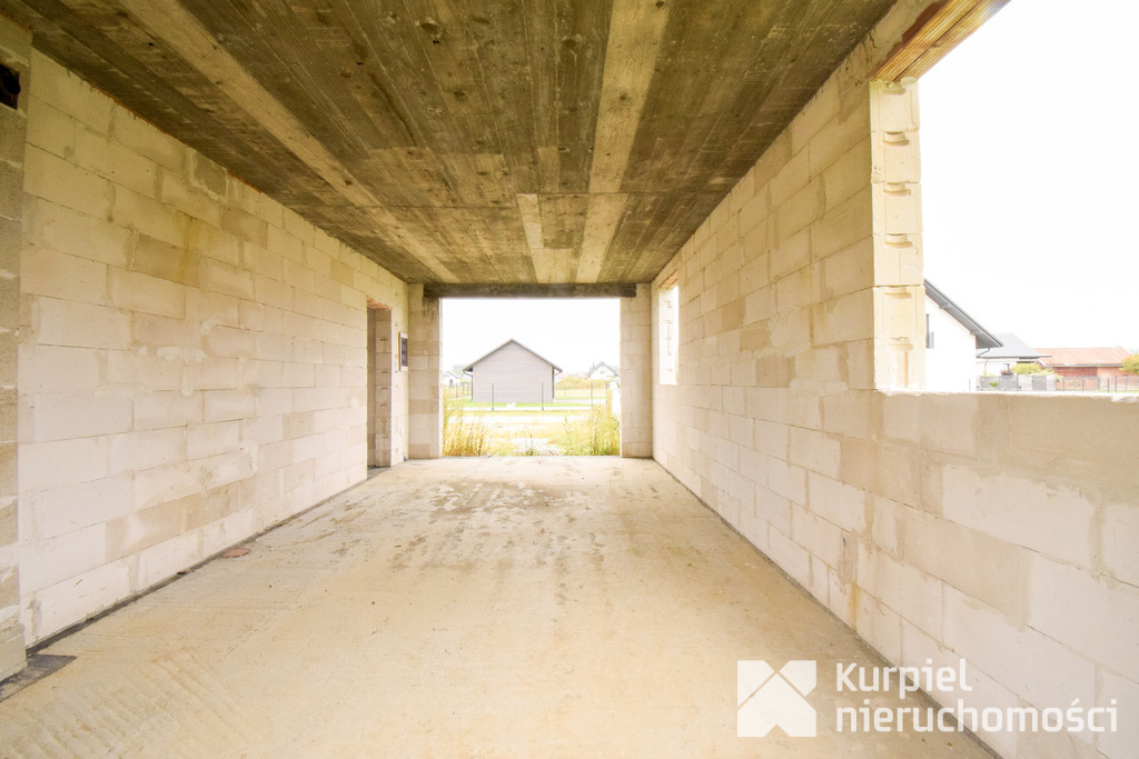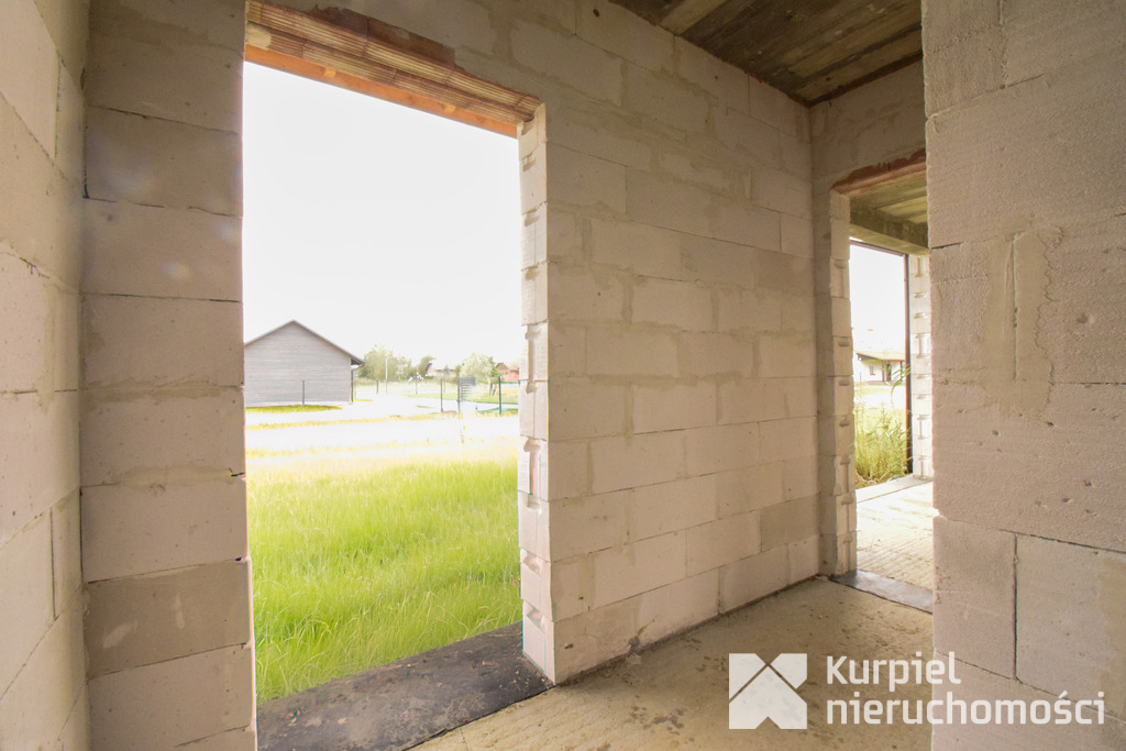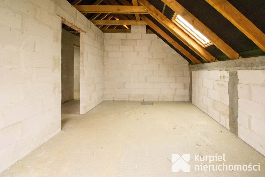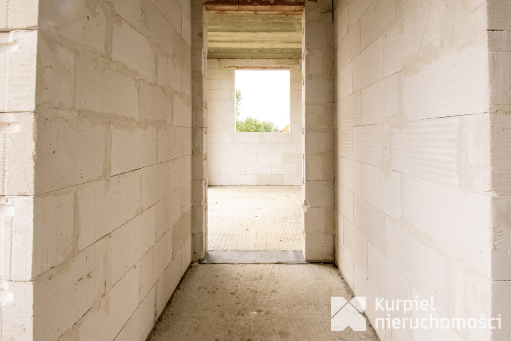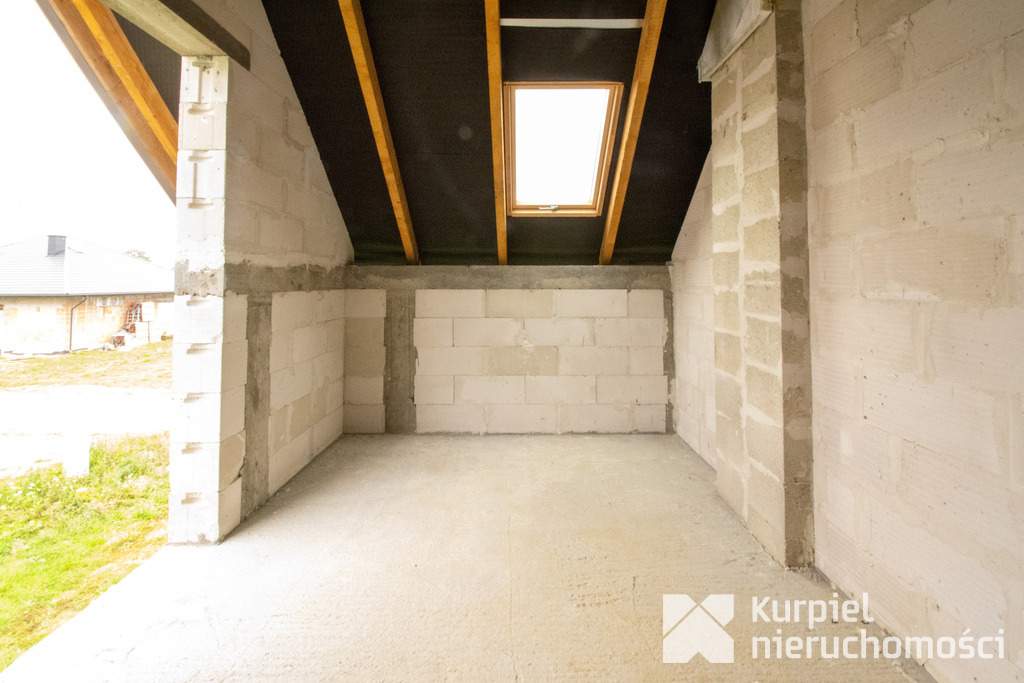 Dom wymaga wykończenia od zera – same mury, otwarty stan surowy – co daje pełną swobodę wyboru materiałów, układu wnętrz, wykończenia i instalacji.