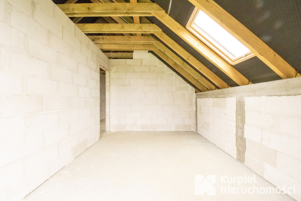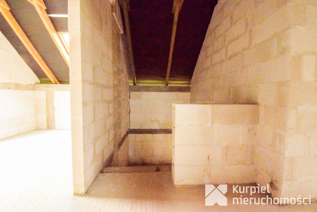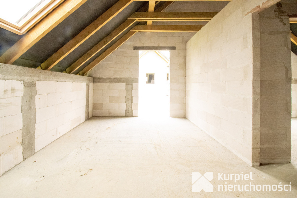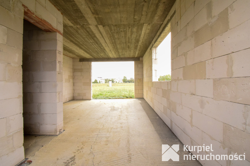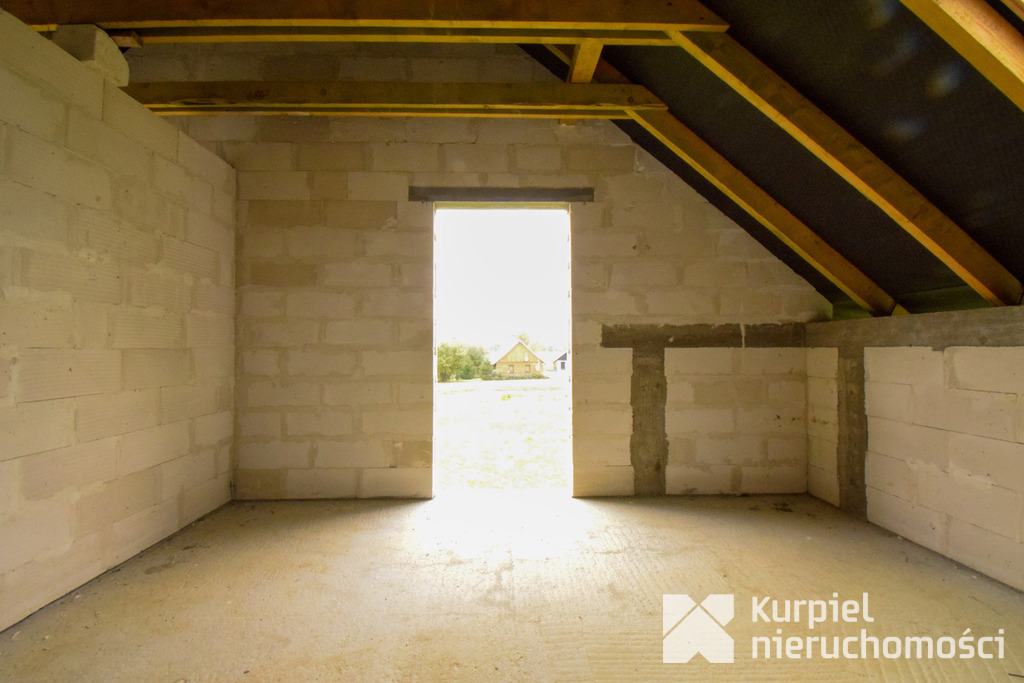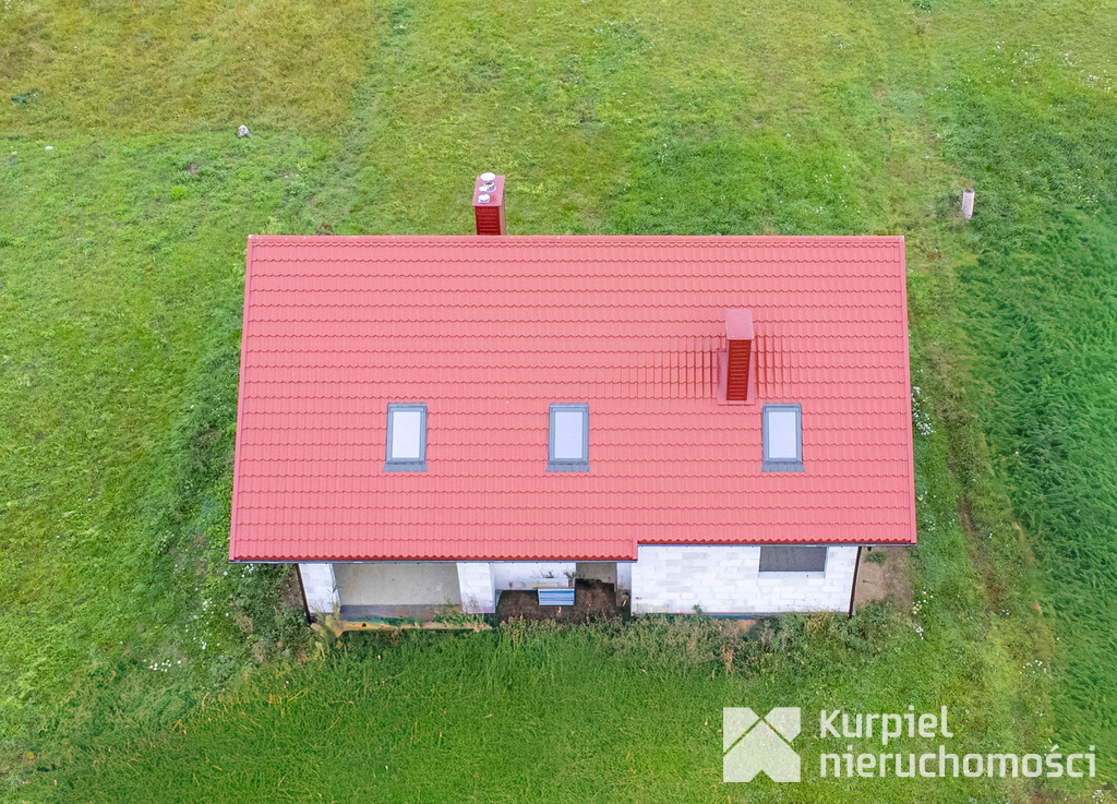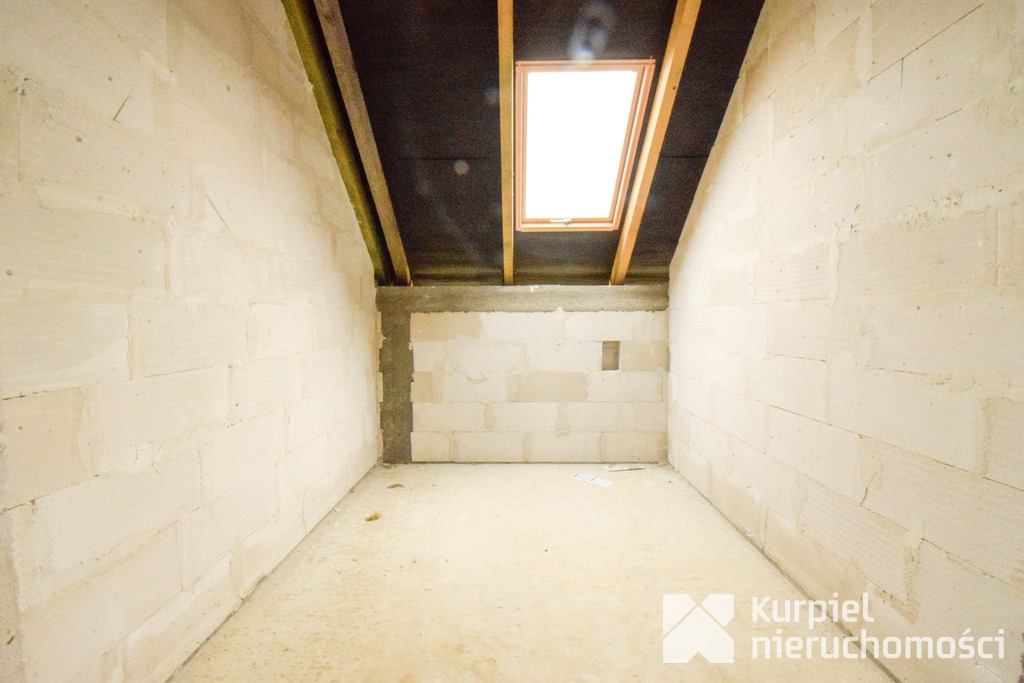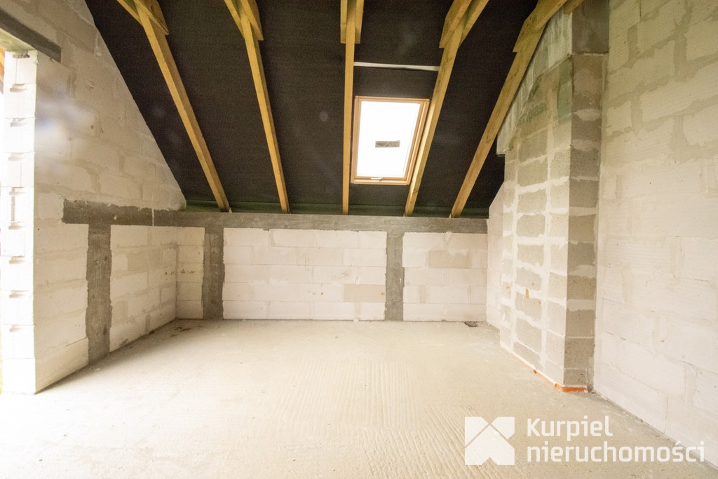 Dom wymaga wykończenia od zera – same mury, otwarty stan surowy – co daje pełną swobodę wyboru materiałów, układu wnętrz, wykończenia i instalacji.