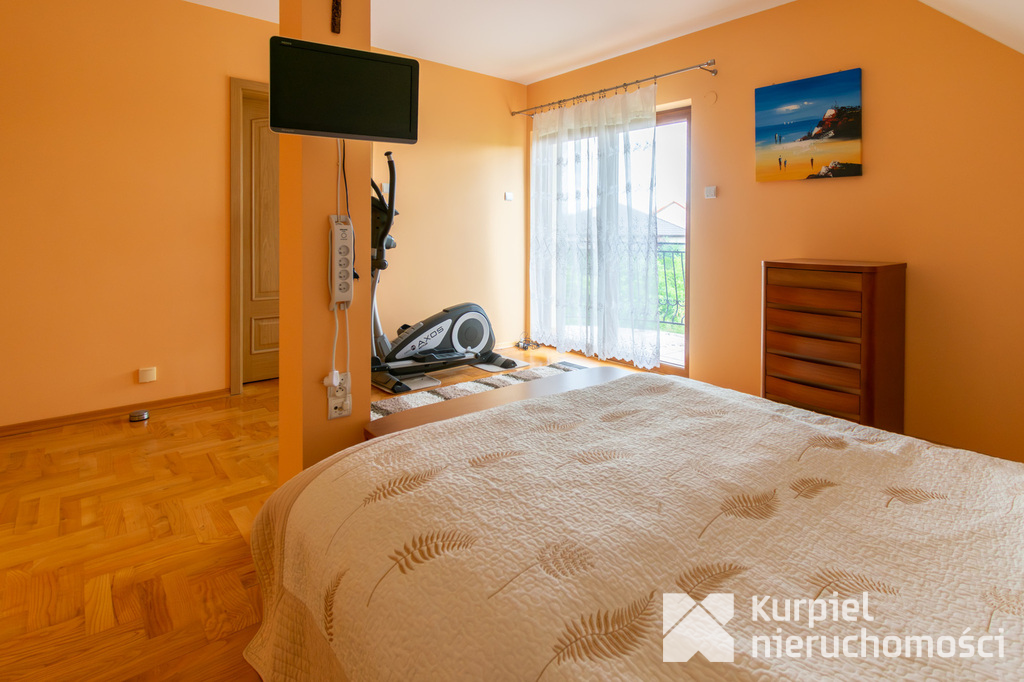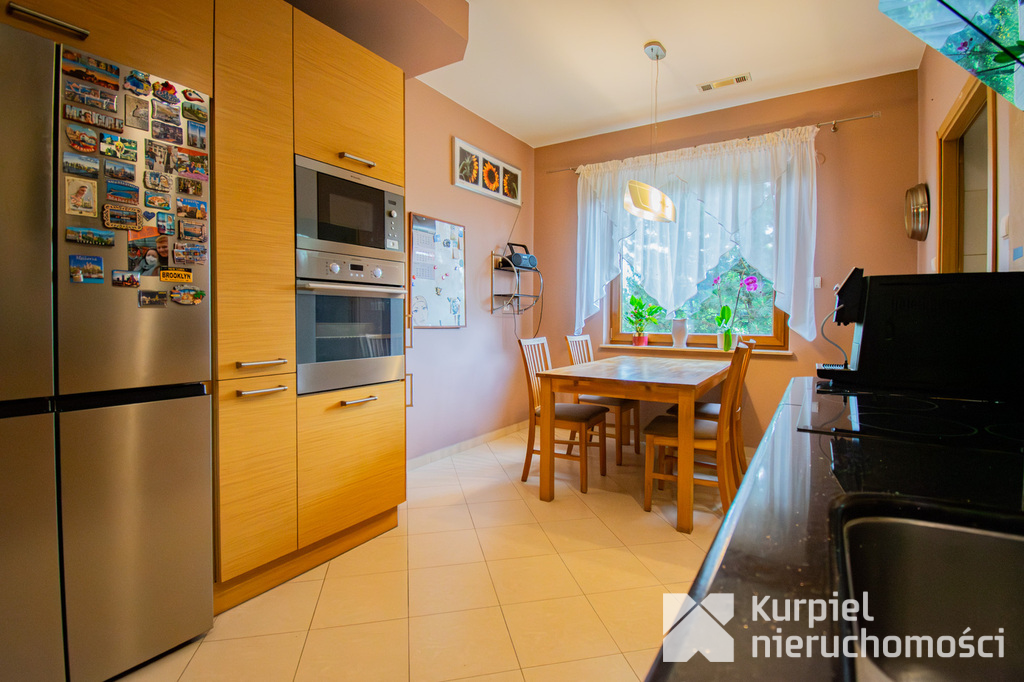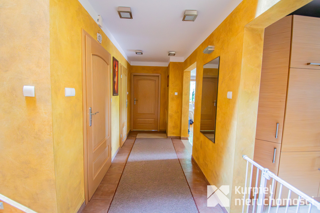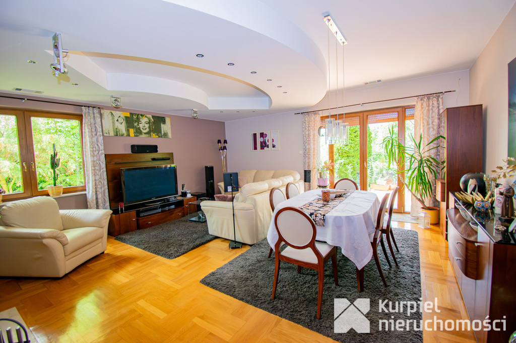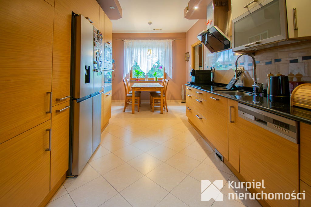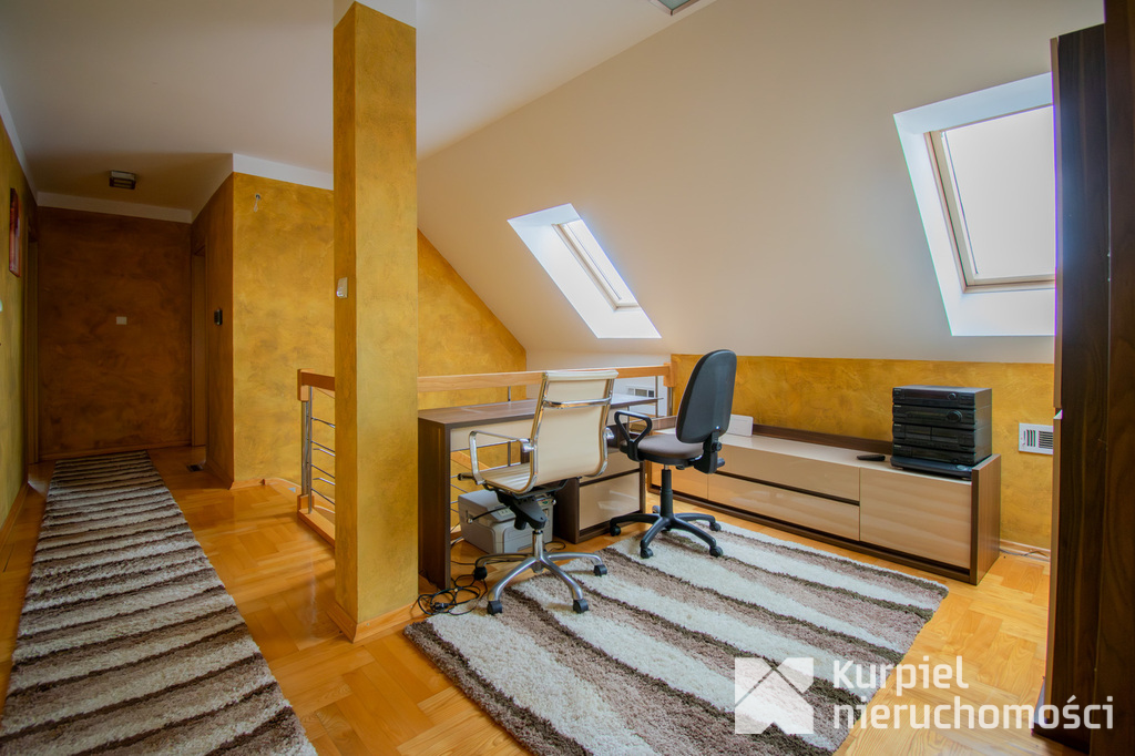 Parter: przestronny salon z kominkiem i wyjściem na fantastyczny taras, duża kuchnia z zabudową i pełnym wyposażeniem, dodatkowa kuchnia robocza (idealna po powrocie z zakupów), gabinet/sypialnia, łazienka, hall, kotłownia oraz garaż na dwa auta.