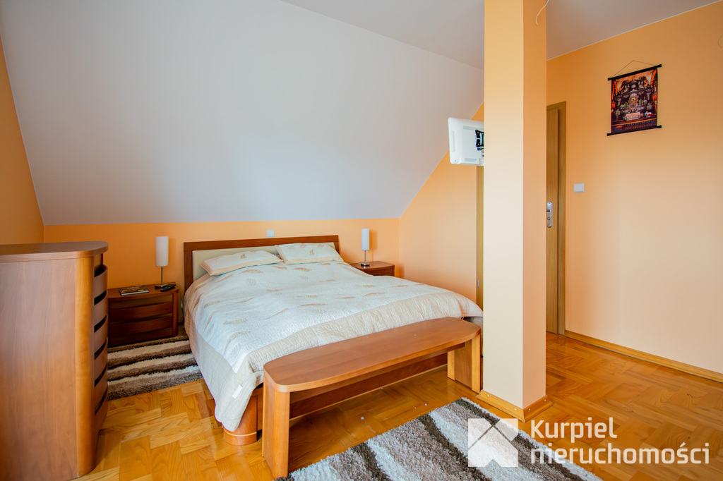 Piętro: dwie niezależne sypialnie, główna sypialnia z własną łazienką, wanną, balkonem i garderobą, plus dodatkowa łazienka z wanną i prysznicem.
