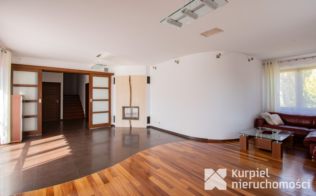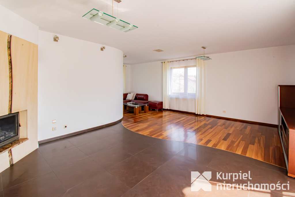 Parter: Przestronny salon z kominkiem i wyjściem na taras, w pełni wyposażona kuchnia wraz z jadalnią, łazienka z prysznicem, gabinet oraz hol.