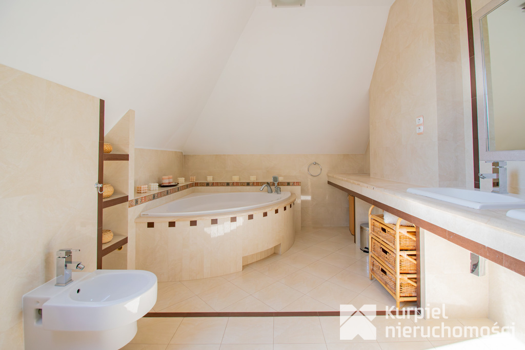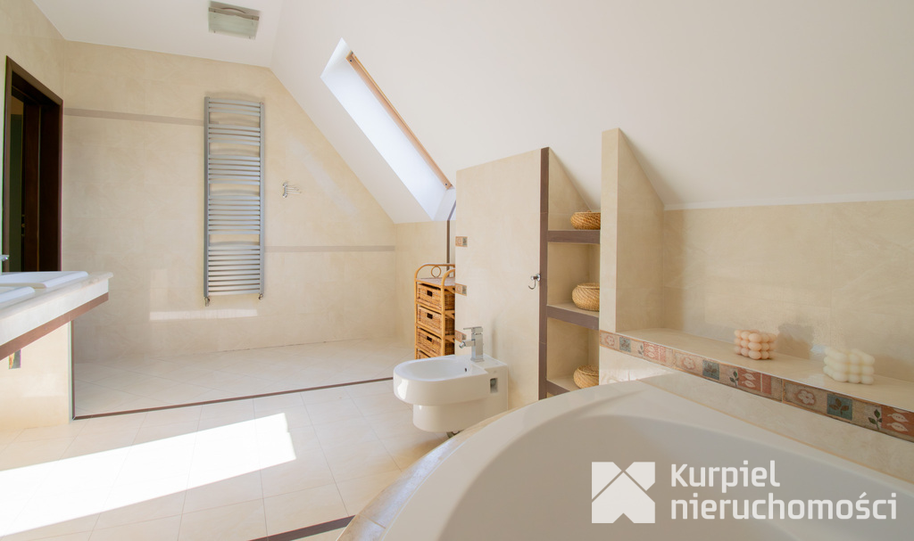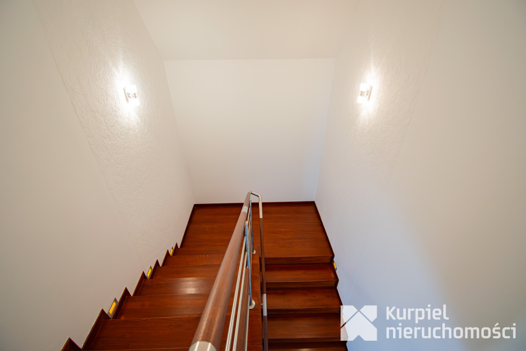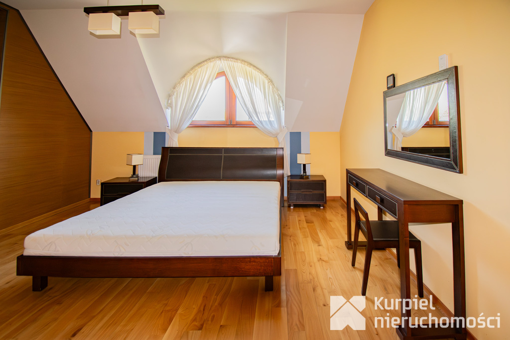 Pierwsze piętro: Główna sypialnia z garderobą, 2 pokoje, łazienka z wanną oraz osobna toaleta.