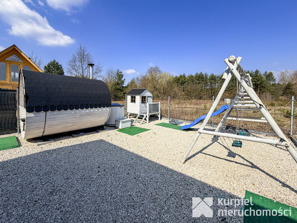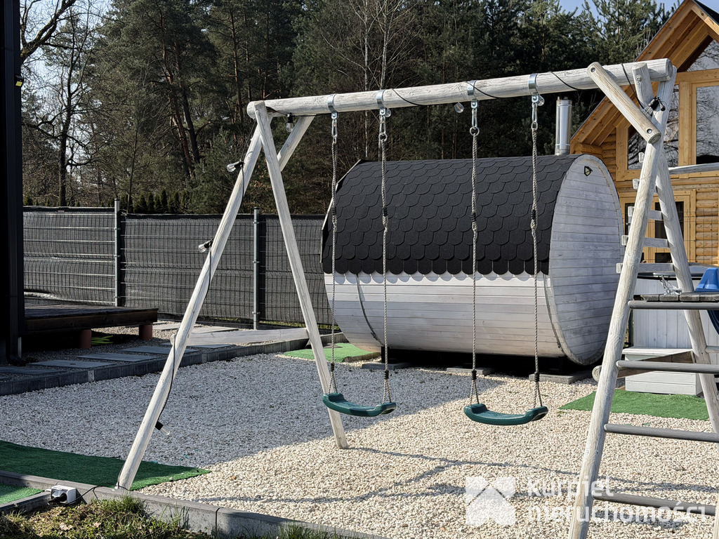 - Zagospodarowana strefa dla dzieci: huśtawki oraz drewniany domek do zabawy.