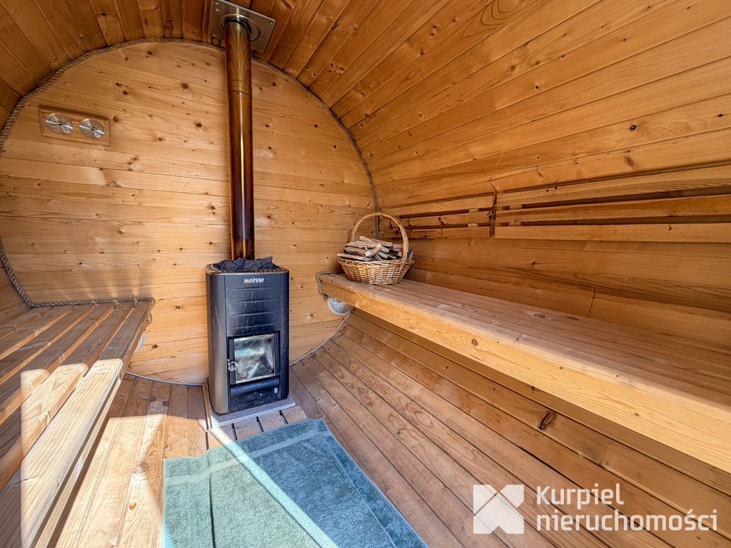 - Prywatna sauna typu „beczka” połączona ze studnią lodową.