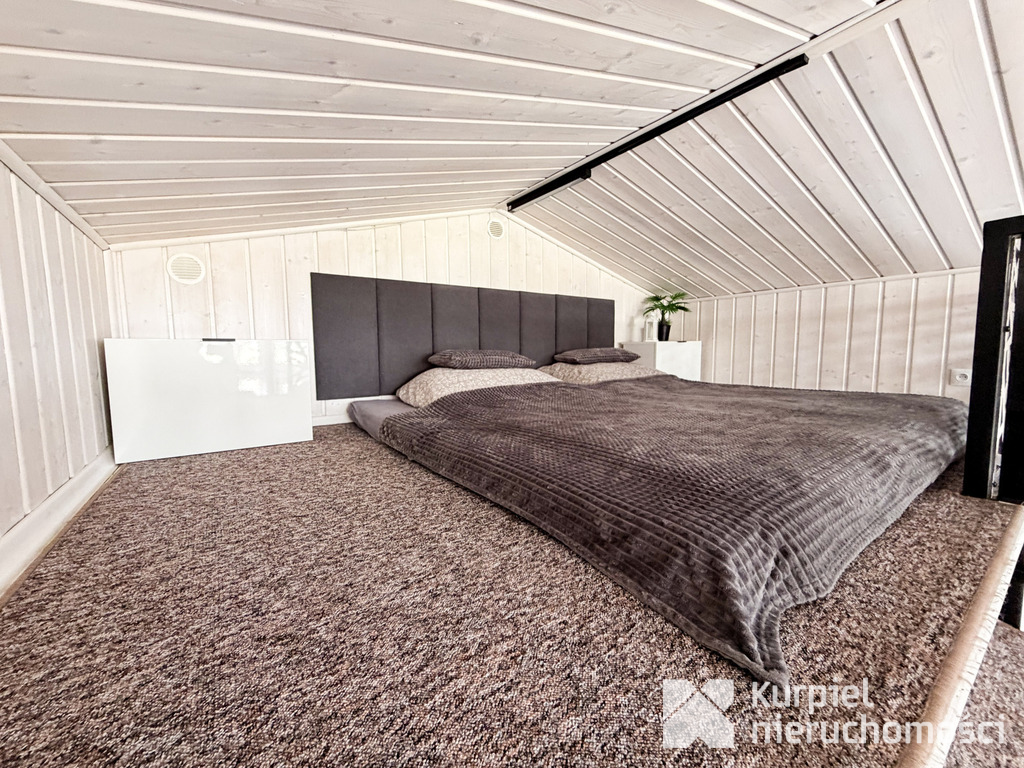 - Antresola podzielona na dwie strefy: główną część sypialną oraz dodatkowy pokój/przestrzeń wypoczynkową.