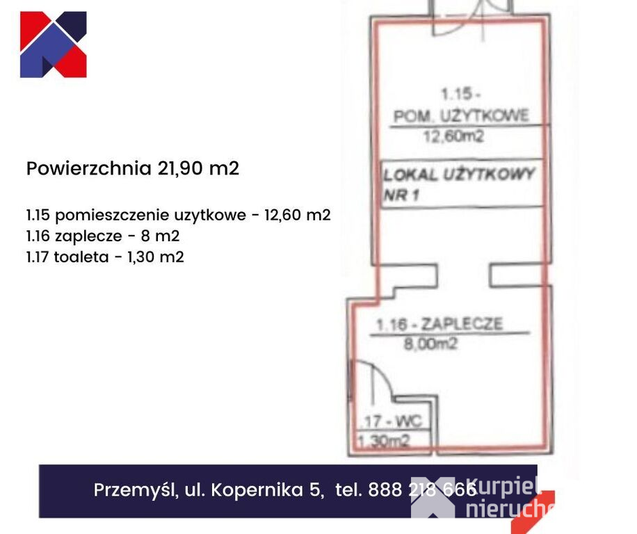 Na sprzedaż lokal użytkowy o łącznej powierzchni 21,90 m², położony w ścisłym centrum Przemyśla, bezpośrednio przy dworcu PKP, przy ul. Kopernika 5.