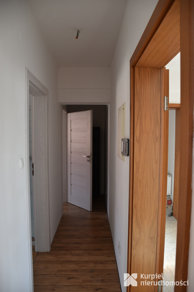Kuchnia jest już wyposażona w szafki, blaty oraz sprzęty AGD. Łazienka jest również wykończona i wyposażona. Na podłogach znajdują się panele.