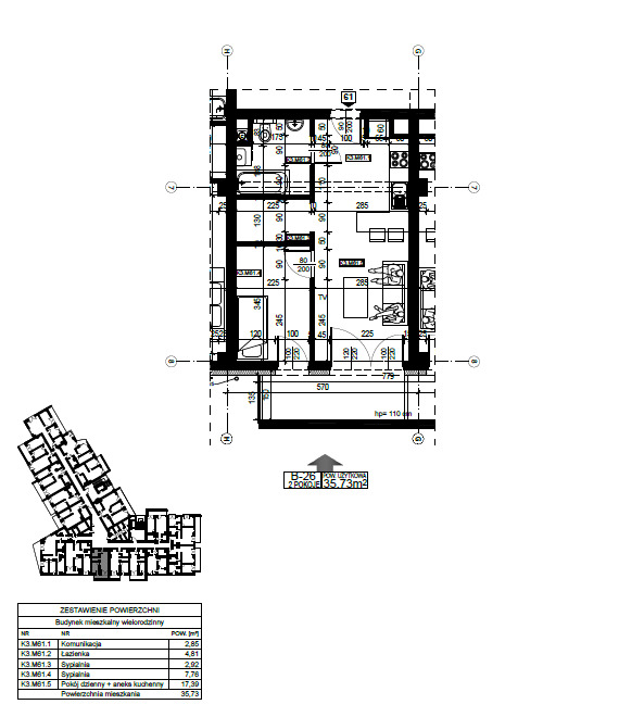 Układ: pokój dzienny z aneksem kuchennym, sypialnia, łazienka, komórka lokatorska