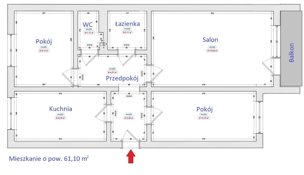 Powierzchnia mieszkania wynosi 61,10 m2 i znajdują się w nim następujące pomieszczenia: