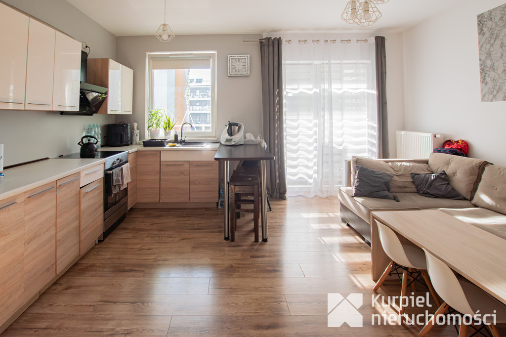 - salon z wyjściem na balkon, połączony z kuchnia z oknem.