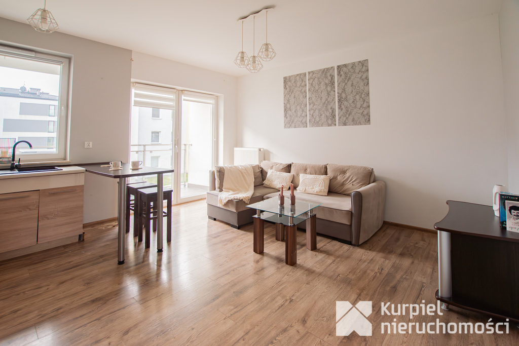 - salon z wyjściem na balkon, połączony z kuchnia z oknem.