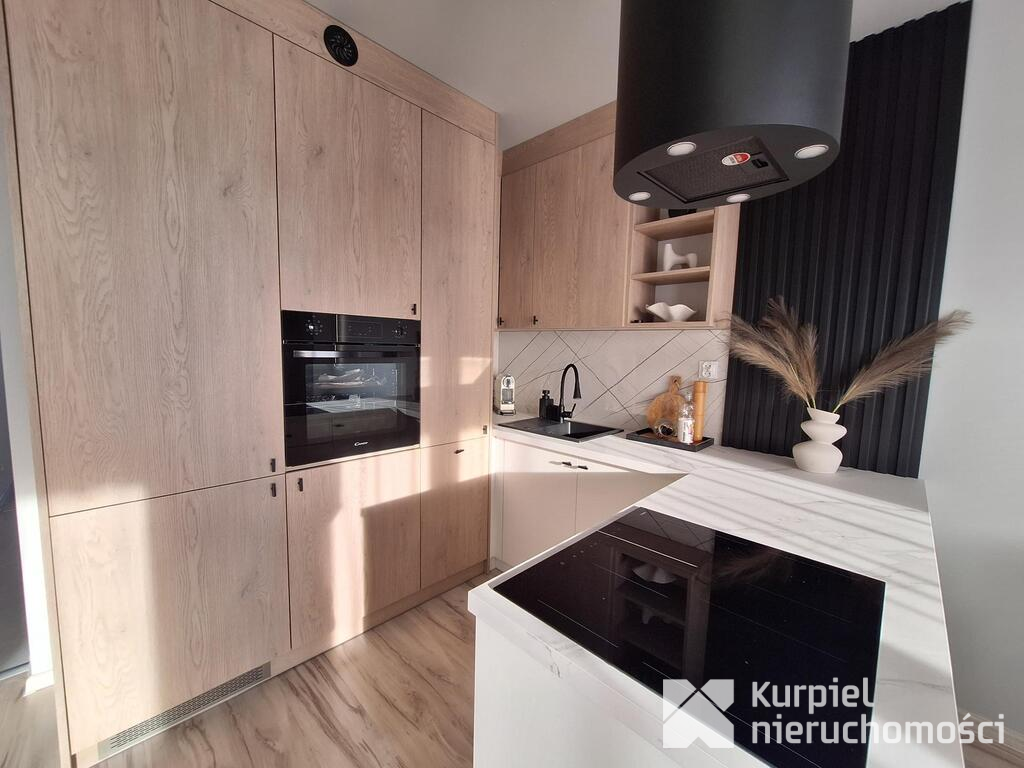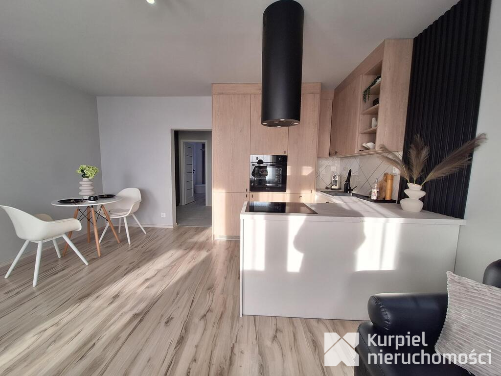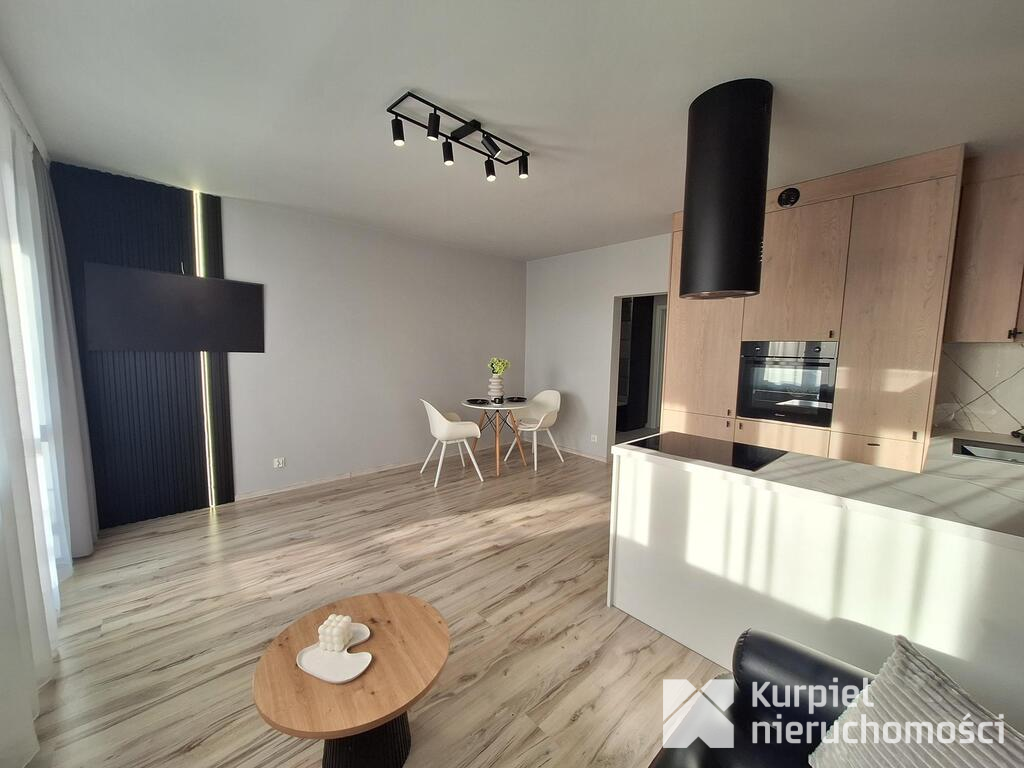 - salon z aneksem kuchennym wyposażonym w nowoczesną, wykonaną na wymiar zabudowę, meble i sprzęty kuchenne w cenie