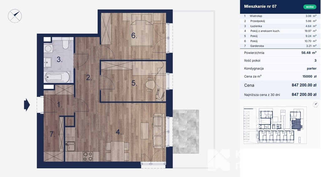Jako partner Inwestora oferujemy do sprzedaży 3 pokojowy apartament o powierzchni użytkowej 56,48 m2, z miejscem postojowym w cenie od 60 000 zł.