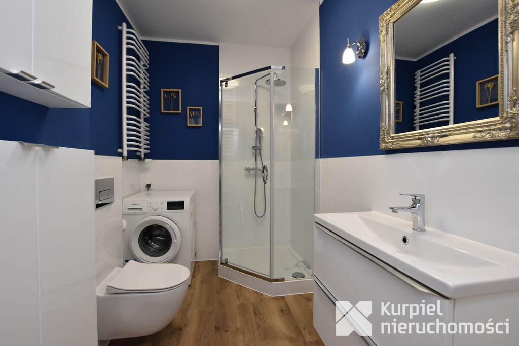 – łazienka – nowoczesna, wyposażona w prysznic, WC i pralkę