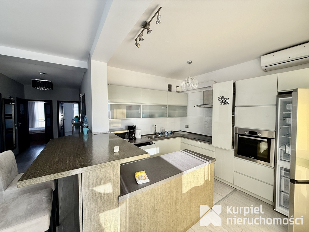 Mieszkanie o pow. ok. 90 m2, składa się z trzech pokoi, salonu połączonego z aneksem kuchennym, łazienki osobnej toalety.