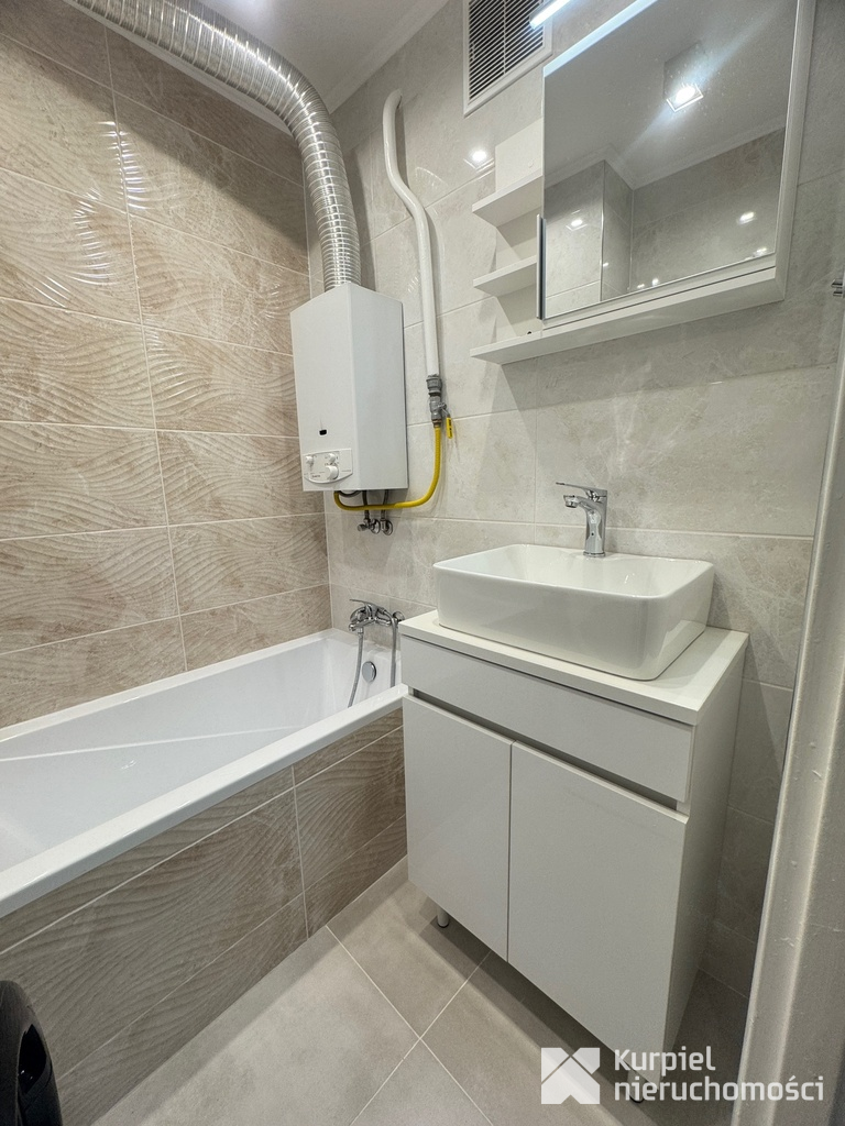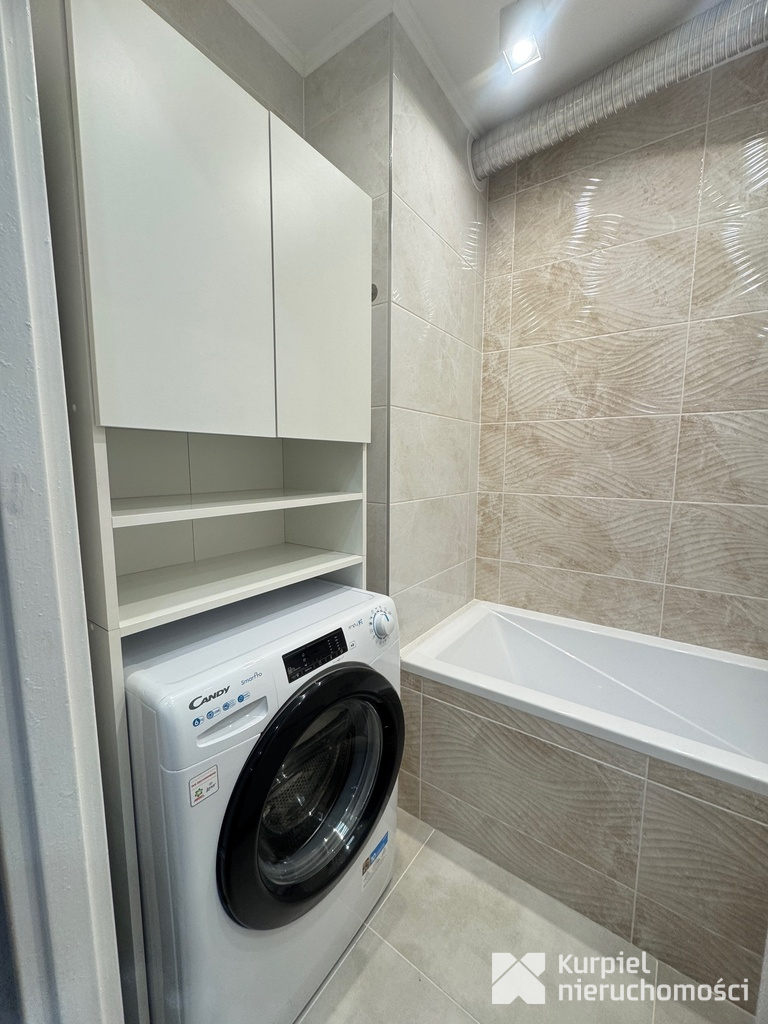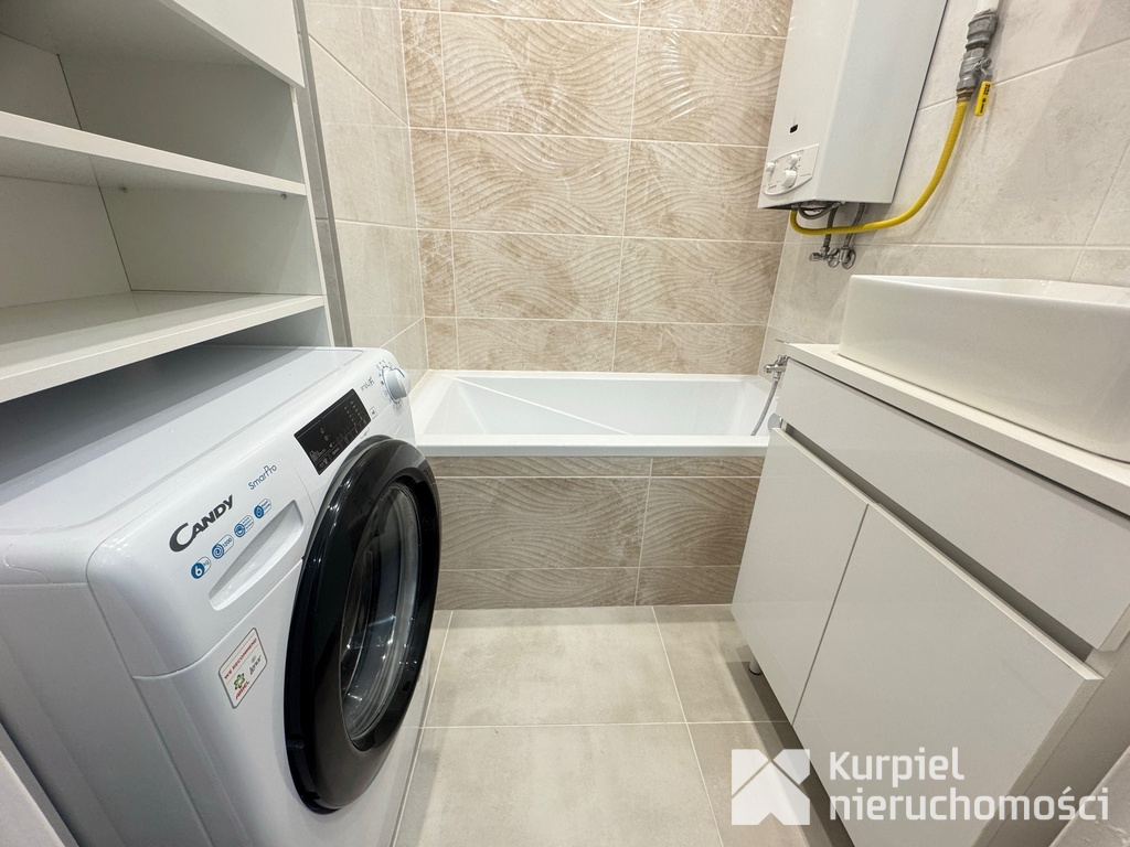 Oddzielna kuchnia została w pełni wyposażona w nowe meble oraz niezbędny sprzęt: lodówkę z zamrażarką, piekarnik, kuchenkę gazową, okap oraz zlew – wszystko nowe i gotowe do użytkowania. Łazienka wyposażona jest w wannę, a do dyspozycji najemcy jest również pralka. Toaleta znajduje się w osobnym pomieszczeniu, co zwiększa funkcjonalność mieszkania.