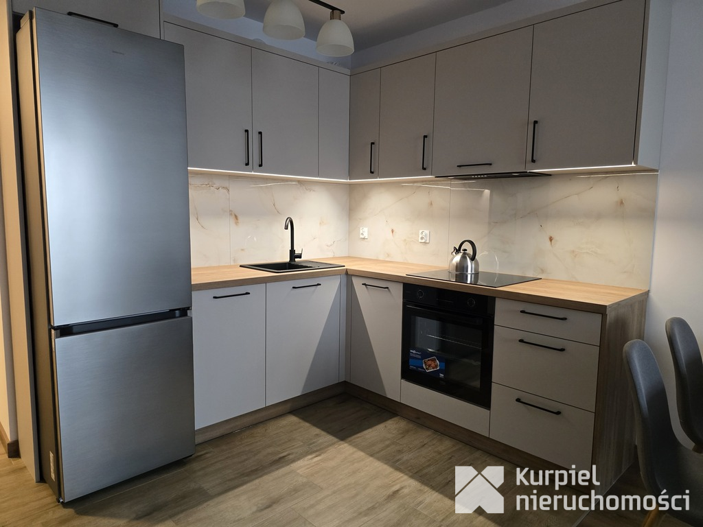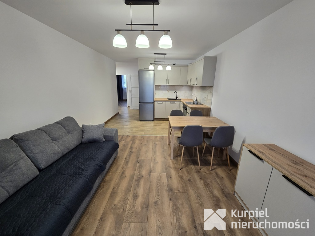 Salon z w pełni wyposażoną kuchnią z niezbędnym sprzętem AGD – lodówka, okap, płyta indukcyjna, piekarnik, zlew oraz zmywarka – gotowe do użycia! Oprócz tego wygodna kanapa, rozkładany stół z 4 krzesłami i pojemna komoda.