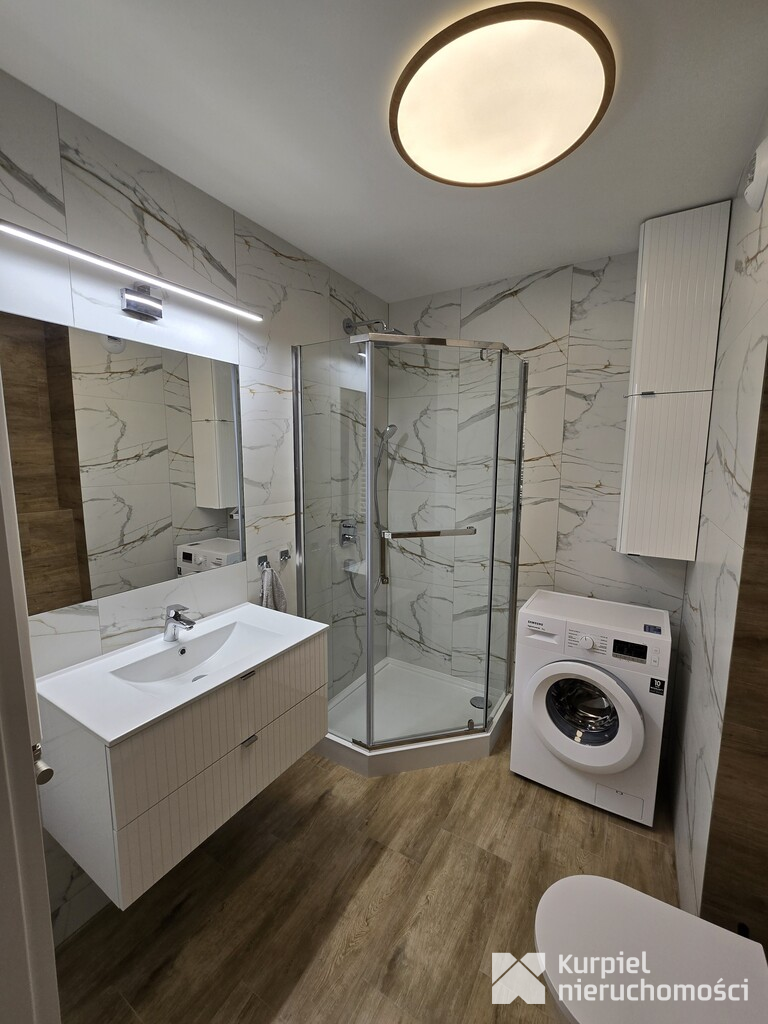 Łazienka wyposażona w nowoczesny prysznic, toaletę, umywalkę oraz pralkę