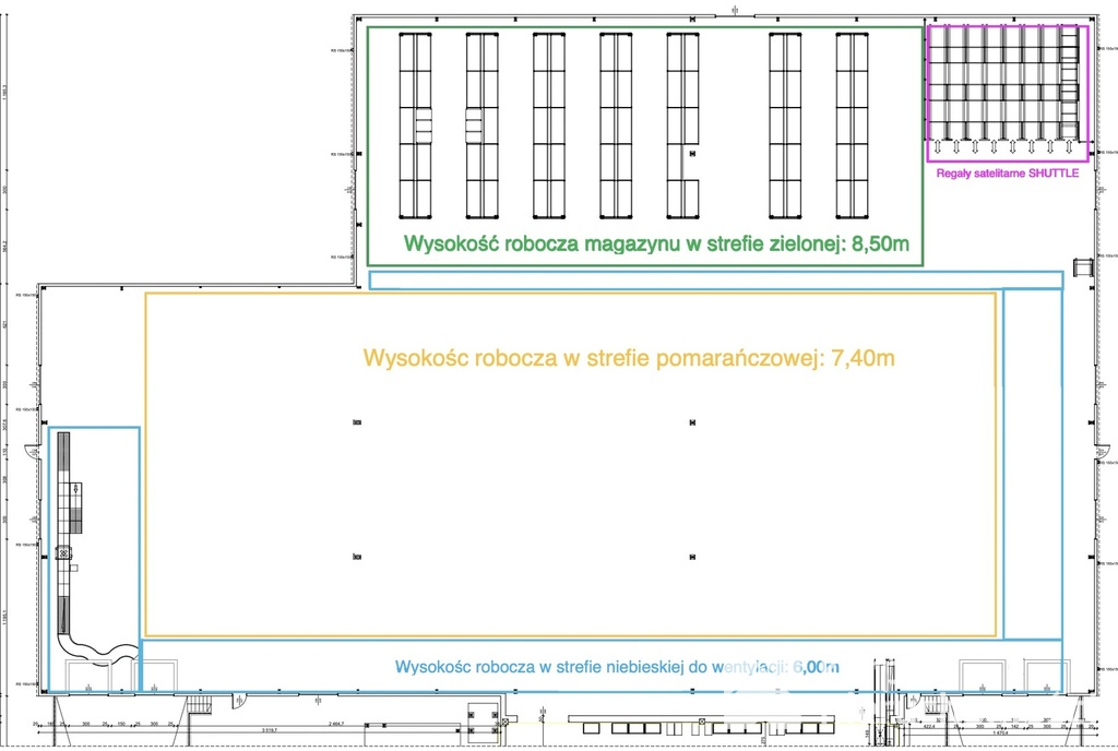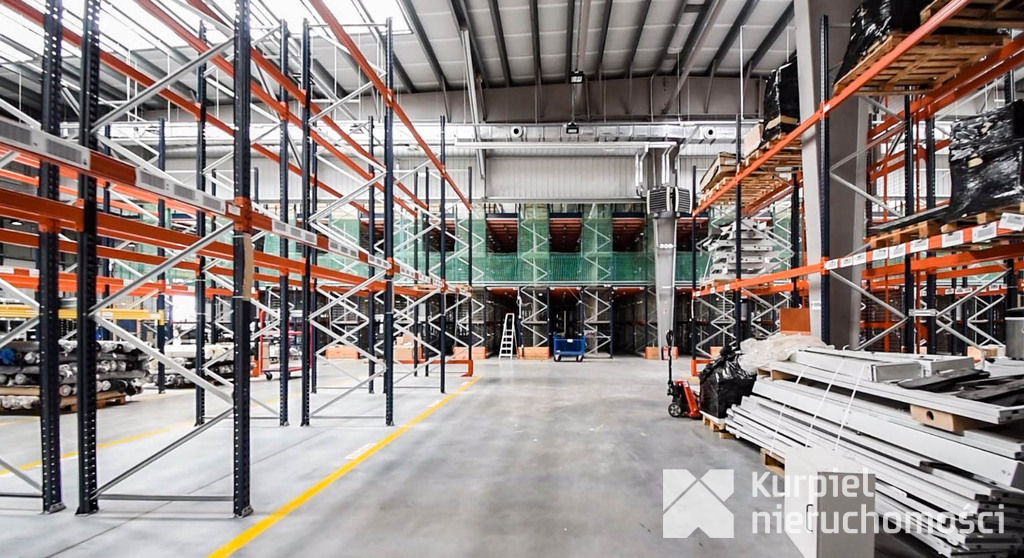 Hala posiada wysokość od 7,4 m do 8,5 m, co umożliwia wysokie składowanie oraz obsługę towarów o dużych gabarytach.